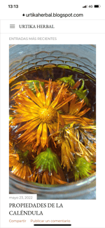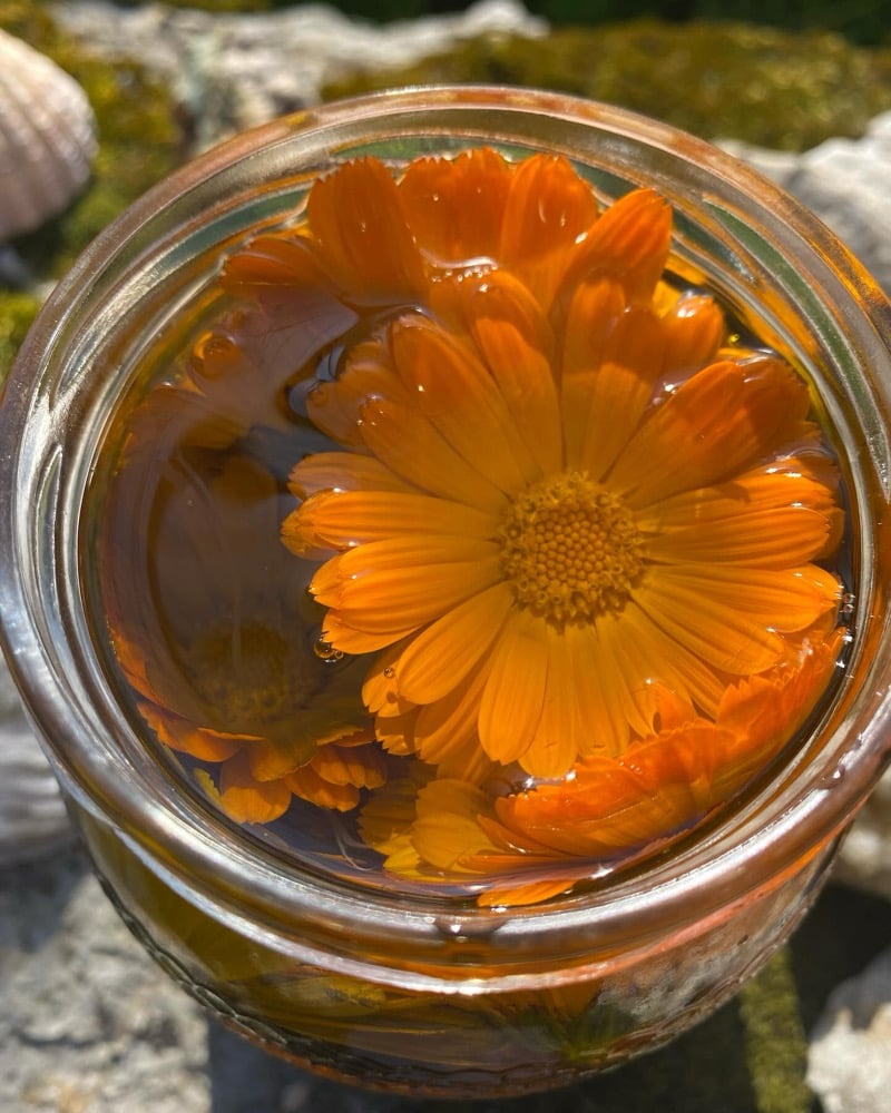 Ingredientes naturales: AOVE ecológico de primera prensa en frío y flores frescas de Calendula officinalis de cultivo propio ecológico.